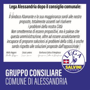 A completare il quadro un’ultima annotazione di carattere politico da parte del gruppo della Lega: “Incertezza sul futuro del Gruppo AMAG con il sentore di cessione del gruppo stesso alle porte ed una parte di maggioranza pronta a non bocciare le nostre proposte, come testimoniato da alcuni voti di astensione. Si tratta di un’evidente frattura politica in seno alla maggioranza? Questo lo vedremo, ma di sicuro occorrerà prenderne atto presto per il bene del futuro della nostra Alessandria”.