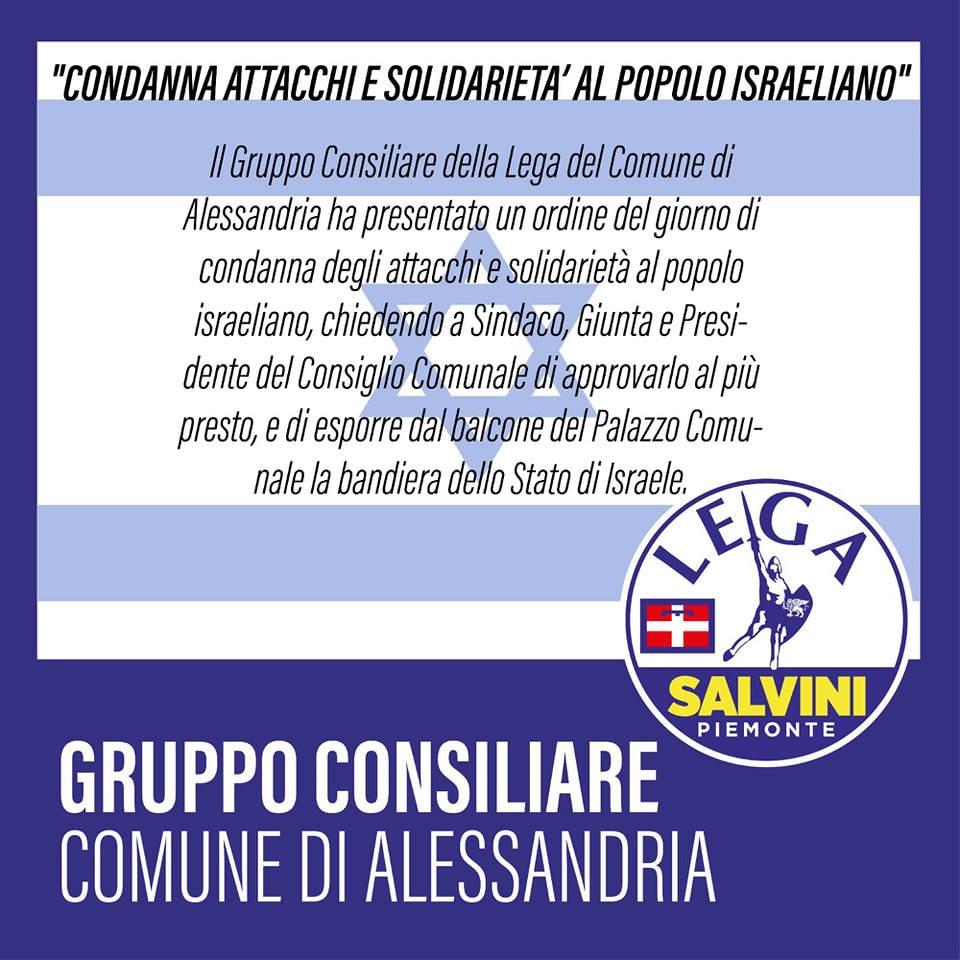 Il Gruppo Consiliare della Lega del Comune di Alessandria ha presentato un ordine del giorno di condanna degli attacchi e solidarietà al popolo israeliano, chiedendo a Sindaco, Giunta e Presidente del Consiglio Comunale di approvarlo al più presto, e di esporre dal balcone del Palazzo Comunale la bandiera dello Stato di Israele.